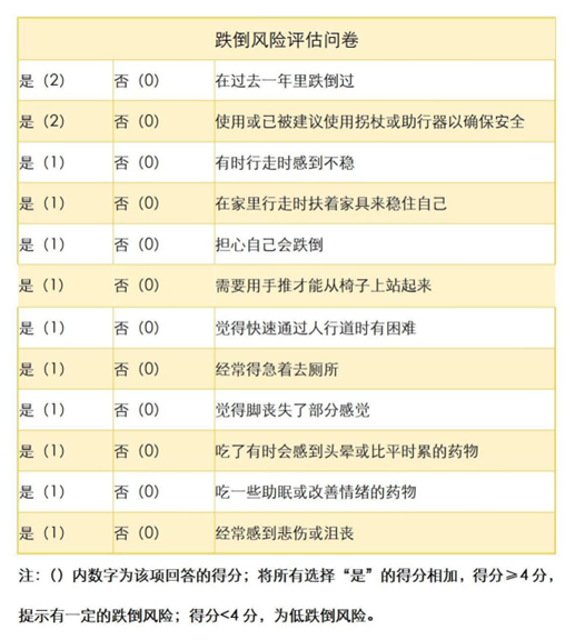 一、老年人为什么容易跌倒 老年人跌倒有内在和外在两方面的原因。 1. 内在原因 老年人的平衡觉(视觉、本体觉、前庭觉)功能下降;老年人骨骼肌的爆发力和耐力减弱,关节活动度降低。老年人通常同时患有高血压、糖尿病、慢性呼吸系统疾病等多种疾病,也会增加跌倒的风险。 2.外在原因 环境因素:如室内、室外光线昏暗,缺少必要的防滑设施和扶手等辅助设施,室内家具摆放位置不合理或环境混乱,衣服或鞋子不合体等。社会因素:受教育程度、个人收入、医疗保障等情况,会影响老年人对自身健康的认识,造成有的老年人无视衰老带来的变化,对预防跌倒缺乏足够的重视。药物因素:老年人共患疾病多,经常需要服用多种药物,这是跌倒风险增加的一个重要因素。有证据显示,服用精神类药物和降血糖药物,会增加老年人的跌倒风险,且同时服用多种药物,也会增加老年人的跌倒风险。 二、如何判断是否有跌倒风险 年龄相同的老年人因身体条件、健康状况等不同,跌倒风险也会不同。老年人可以通过以下两种简易方法,对自己的跌倒风险进行判断: 1.试着回答以下3个问题 最近一年内是否发生跌倒? 是否有步行或平衡困难? 是否存在明显的急性跌倒? 2.通过完成下图的问卷