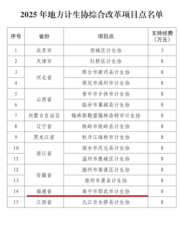5月29日,中国计划生育协会印发《关于确定地方计生协综合改革项目点的通知》,邵武市计生协被确定为全国第七批36个综合改革项目点单位之一,系2025年度福建省唯一入选单位。项目周期为2025年5月29日至2026年12月1日。