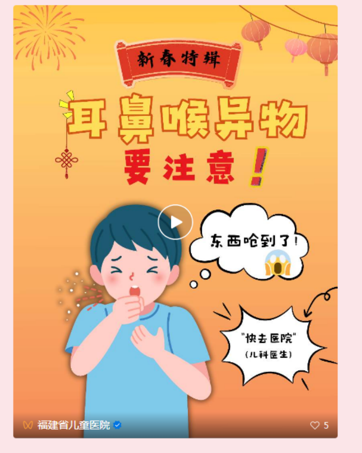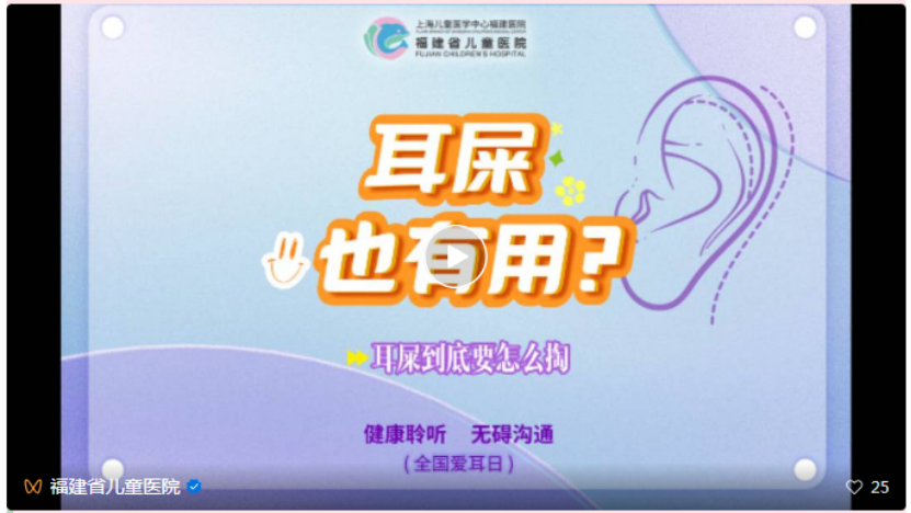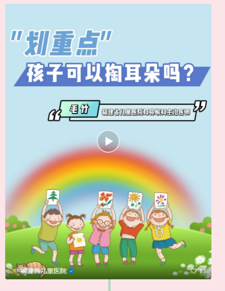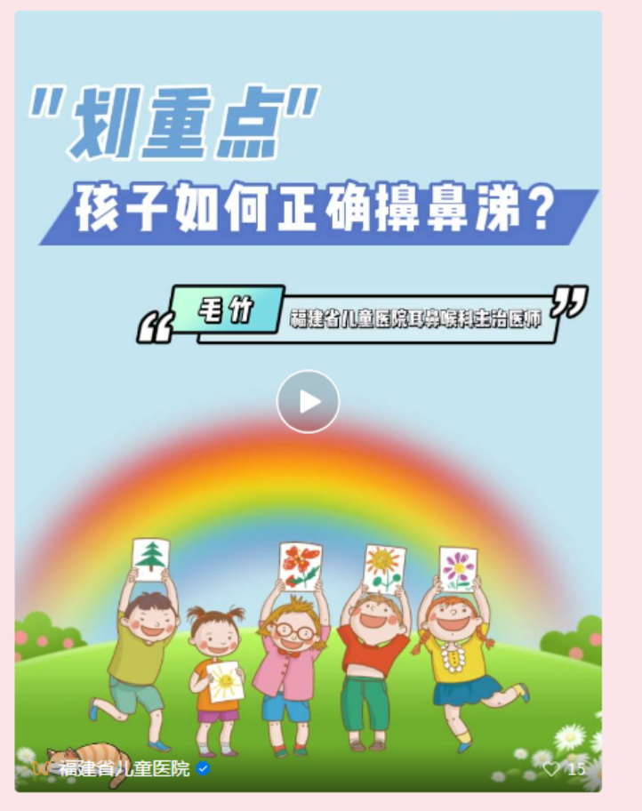 前言 省计生协会携手上海儿童医学中心福建医院(福建省儿童医院)联合推出“儿童健康大讲堂”专栏,聚焦儿童成长健康管理、疾病预防及科学养育等问题,通过医疗专家解读实用知识科普,为广大家长提供专业、贴心的育儿指导,助力儿童健康成长。 很多小朋友擤鼻涕时 经常两只鼻子一起擤 这样可能会对 中耳部位造成损害 进而导致中耳炎 如何教孩子正确擤鼻涕? 小朋友的 耳屎到底要不要掏? 耳鼻喉有异物了又该怎么处理? 很多家长 在处理方式上存在很多误区 上海儿童医学中心福建医院 (福建省儿童医院) 耳鼻喉科团队 提醒 儿童耳鼻喉结构特殊 不当处理可能造成二次伤害 下面一起来学习相关知识 如何正确擤鼻涕? 耳屎也有用 孩子可以掏耳朵吗? 测测你是对高频声音敏感, 还是低频声音敏感 如何正确使用耳机? 警惕分泌性中耳炎 警惕耳鼻喉异物 医院简介 上海儿童医学中心福建医院(福建省儿童医院)是党的十九大以来我省卫生计生领域第一个开工建设的民生补短板重大项目。2020年12月25日,医院正式开诊运营,2021年6月,获批立项第二批国家“区域医疗中心试点项目”,2023年获批成为福建省儿科专业质量控制中心。2024年,儿科、儿外科2个专业基地获批“国家住院医师规范化培训基地”。医院占地面积233亩,建筑面积22.7万平方米,编制床位1000张,现有职工930人,硕博导58人,柔性引进客座专家、特聘专家41名,柔性引进人才团队2个,5个省级专科分会挂靠医院开展工作,获批省级临床医学中心1个,省级临床重点专科建设项目12个,省级临床医学研究中心1个。开诊以来,医院累计门急诊量226.3万余人次、出院10.69万余人次、完成手术近4.24万例,年均增长率分别为42.30%、40.60%、37.50%,其中三四级手术占比63.66%,开院至今累计开展新技术新项目219项,其中开展全国首例8例,省内首例18例,医院疑难危重症病种覆盖率达93.64%,核心技术覆盖率达85.71%;医院SCI发表数量年均增长57.93%,科研项目立项数年均增长48.68%,其中国家级项目2项,省卫健委重大专项5项。 科室简介 福建省儿童医院耳鼻喉科与上海医学中心耳鼻喉科深度合作,引进先进的诊疗技术,共同建设高水平的儿童耳鼻喉科,立足省会福州,为全省儿童的耳鼻咽喉健康保驾护航。科室医护人员人才梯队完善,具有丰富的专科临床诊治经验,硬件配套上拥有规范化听力室及听力筛查、诊断所有进口检测设备、进口耳鼻喉诊疗台、国际先进的手术系统。目前开展耳鼻喉科常见病及疑难病诊治、儿童听力筛查诊断及治疗、过敏性鼻炎脱敏治疗、耳聋基因遗传咨询、耳前瘘管及腮裂瘘管切除、中耳疾病内外科综合治疗、儿童阻塞性睡眠低通气综合征外科治疗(扁桃体、腺样体切除术)手术等业务。