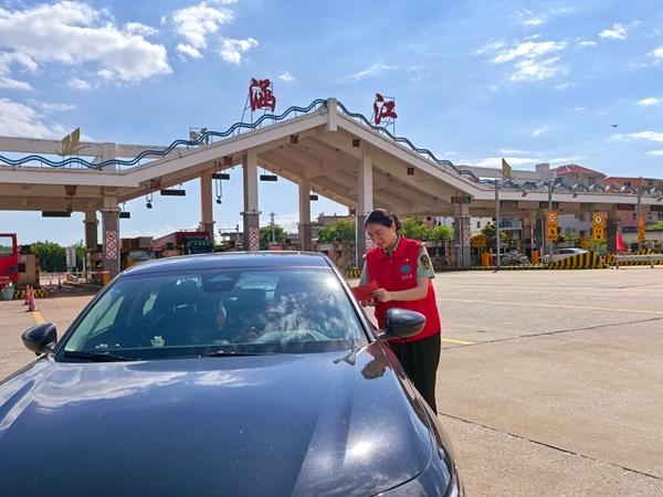 (无人机巡查 黄鹏摄) 党旗飘扬显担当。“福路·友爱”志愿服务队的红马甲,成为21个志愿服务点最醒目的标志。党员志愿者不仅备好热水、晕车药与修车工具,还精心准备了装满文创书签、桂花香薰的国庆礼包。涵江收费站党员陈君芳的口袋里,总装着两样“宝贝”:写着地方特色景点路线的便签纸和一盒创可贴。当遇到司机摇下窗问询导航上“不好找”“看不懂”的地点时,那张便签纸便成了最可靠的“人工导航”;而那盒创可贴虽不常用,却曾经在路遇孩子不小心磕碰时,及时抚平了伤口和家人的焦虑。24 小时值班值守制度与“12122”热线无缝联动,确保每通求助电话都能“秒响应”。