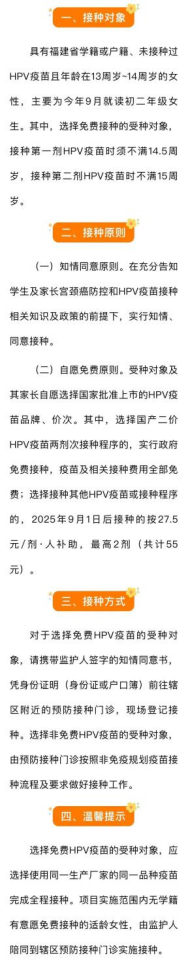 好消息! 9月起 福建13至14岁女性 可免费接种HPV疫苗 为积极响应国家加速消除宫颈癌行动计划,根据福建省委、省政府的部署,省卫健委联合省教育厅、省财政厅、省妇联,持续完善适龄女性人乳头瘤病毒(HPV)疫苗接种项目,为具有福建省学籍或户籍、未接种过HPV疫苗且年龄在13周岁至14周岁的女性,提供HPV疫苗接种服务。2025年福建省适龄女性HPV疫苗接种项目即将如期开展。