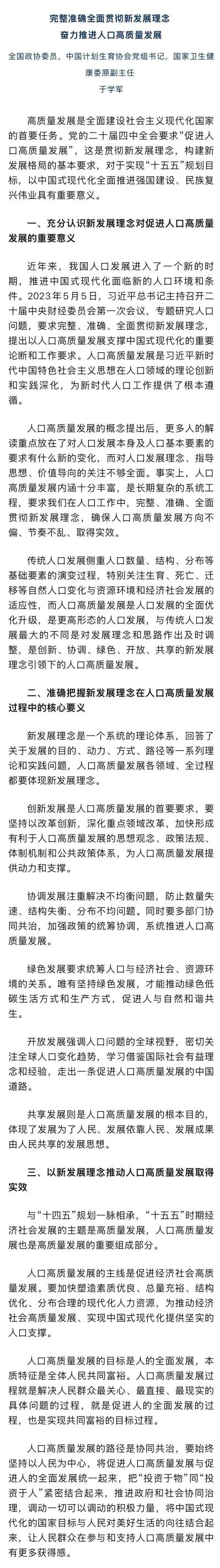 于学军:完整准确全面贯彻新发展理念 奋力推进人口高质量发展