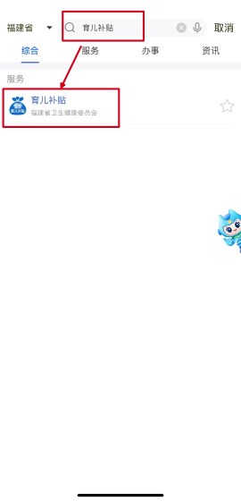 02 闽政通支付宝小程序-育儿补贴 上支付宝搜“闽政通”小程序,进入小程序首页点击"育儿补贴申领“头图、“育儿补贴”服务或腰部banner图。