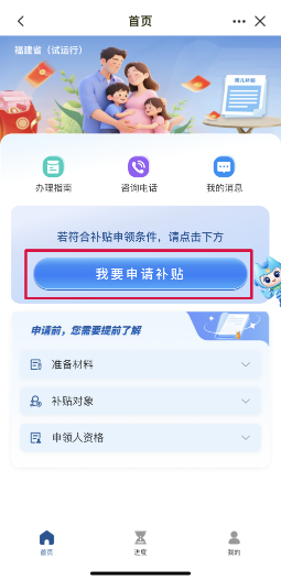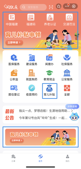 03 闽政通微信小程序-育儿补贴 以闽政通APP为例 第一步:进入闽政通APP,点击首页"育儿补贴申领须知“头图或搜索“育儿补贴”服务。