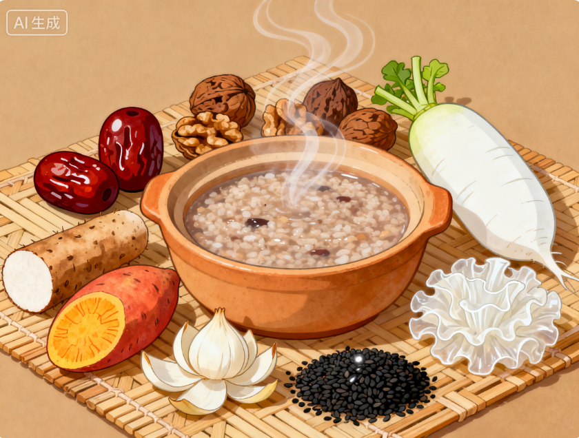 1.食疗调护,温补为主。 若见肺脾气虚(易感冒、乏力、食欲差),可食用红枣、山药、红薯、小米粥,或黄芪、党参炖鸡汤,健脾益气固表。 若见肾阳不足(畏寒、四肢凉),适当食用核桃、黑芝麻、羊肉汤,温阳补肾。 日常可适当多食白萝卜、百合、银耳等润肺食材,防燥防内热。 2.饮食禁忌:忌生冷、油腻、辛辣。 冬季忌食生冷寒凉之物(如冰淇淋、冷饮),以免损伤脾阳;忌过食油腻、甜食,防止痰湿内生;少食辛辣(如辣椒、油炸、炙烤食物),避免助热伤阴。 |