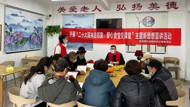 ▲董加顺在社区“长者食堂”宣传二十大精神、推行公勺公筷、践行“光盘行动”